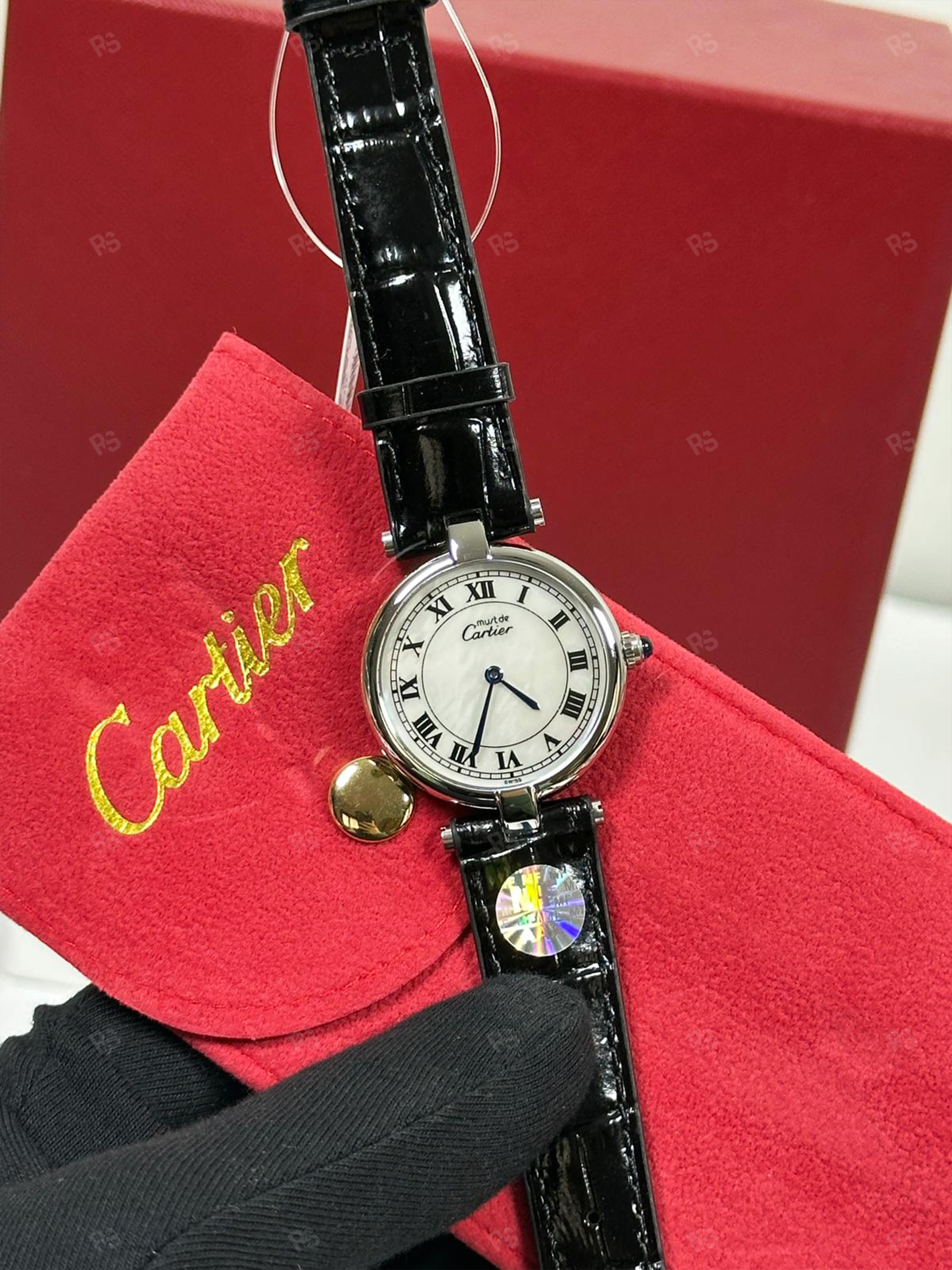 Siyah kordon, beyaz kadran, Cartier zarafeti — klasik şıklık.