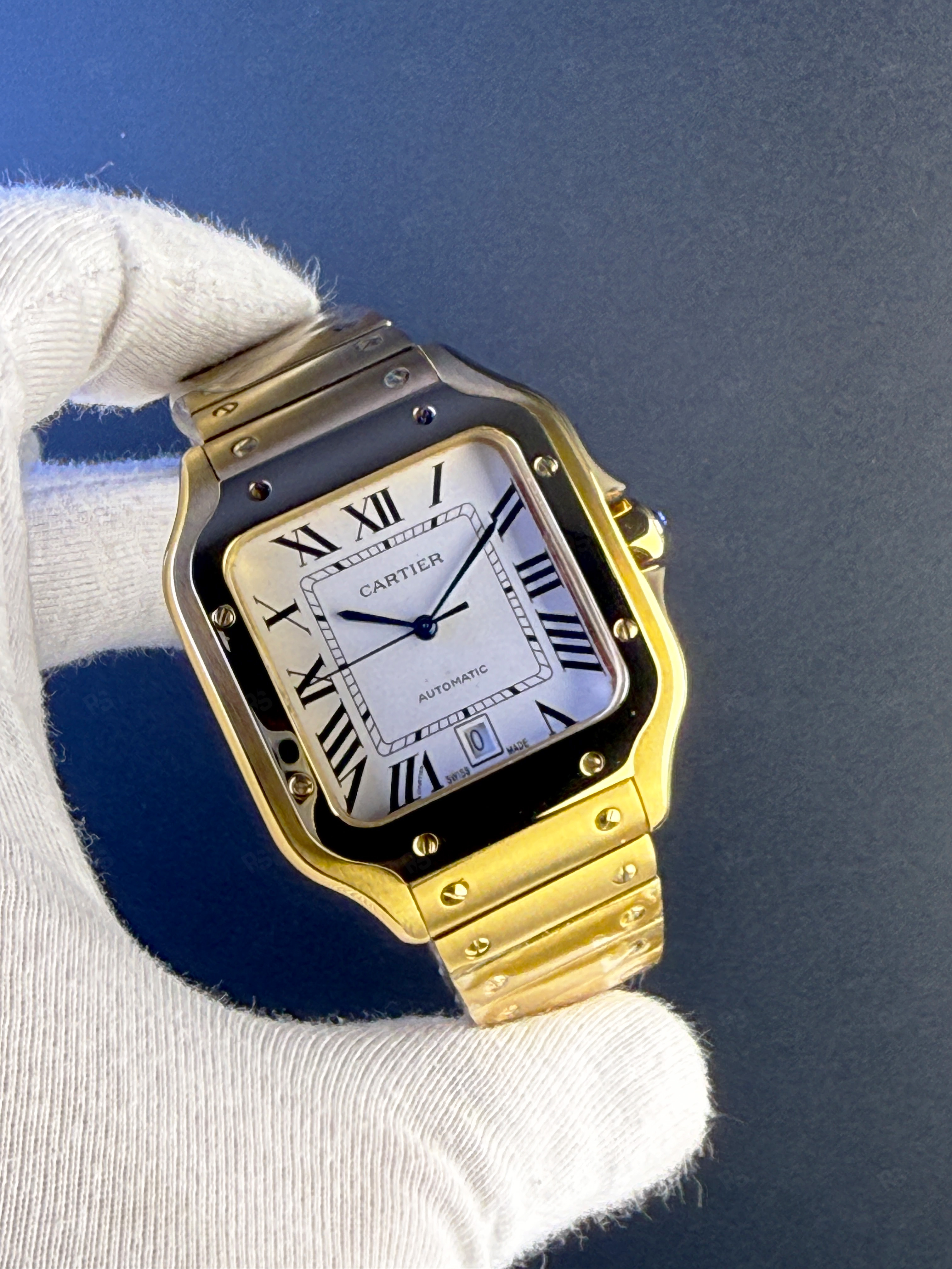 - Kasa: Parlak 18k sarı altından yapılmıştır. Dört köşede yer alan vidalar, Santos serisinin imzasını taşır.