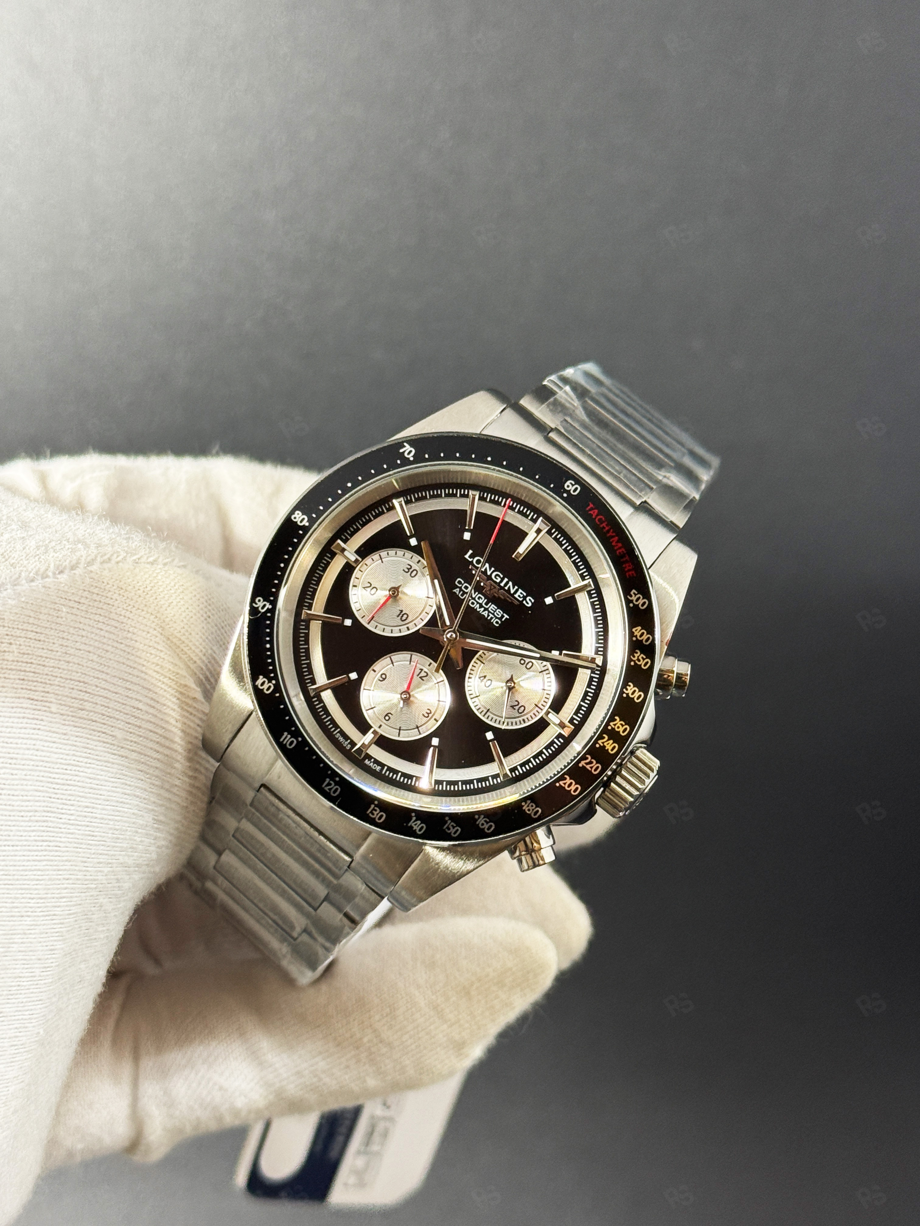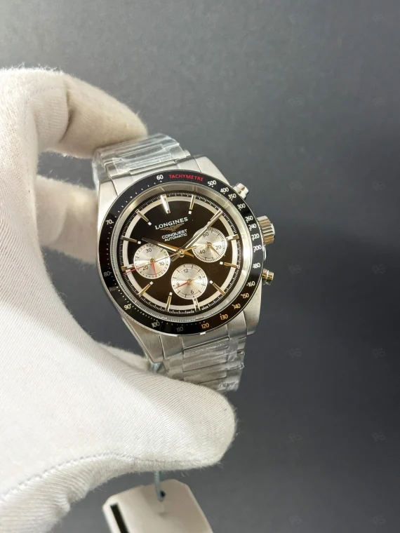Siyah panda kadran, tachymeter, Longines Conquest — sportif zarafet.