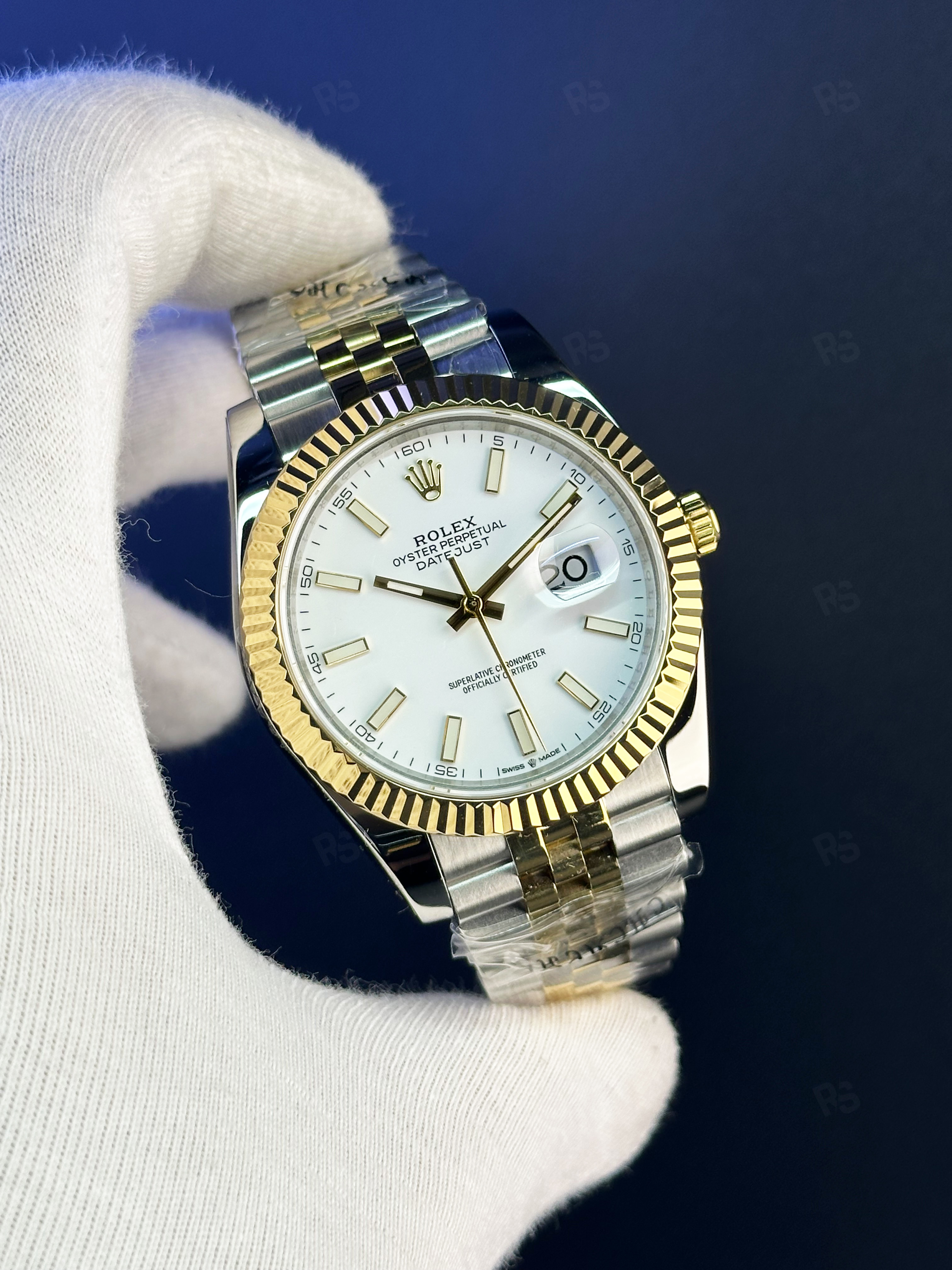 Rolex Datejust 41mm, zarafeti ve sağlamlığı mükemmel şekilde bir araya getiren ikonik bir tasarımdır. Beyaz kadranı, altın fluted bezel ve çelik & altın Jubilee bilezikle birleşerek dikkat çekici bir bütünlük oluşturur. Altın indeksler ve kollar, kadranın sade şıklığını ön plana çıkarır.