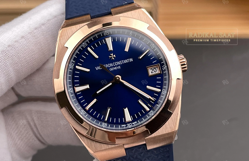 Lüksün sıcak tonu: Vacheron Constantin Overseas 4520V Rose Gold. 8F Factory, mavi kadran, kauçuk kayış. RadikalSaat ile 2 yıl garantili.