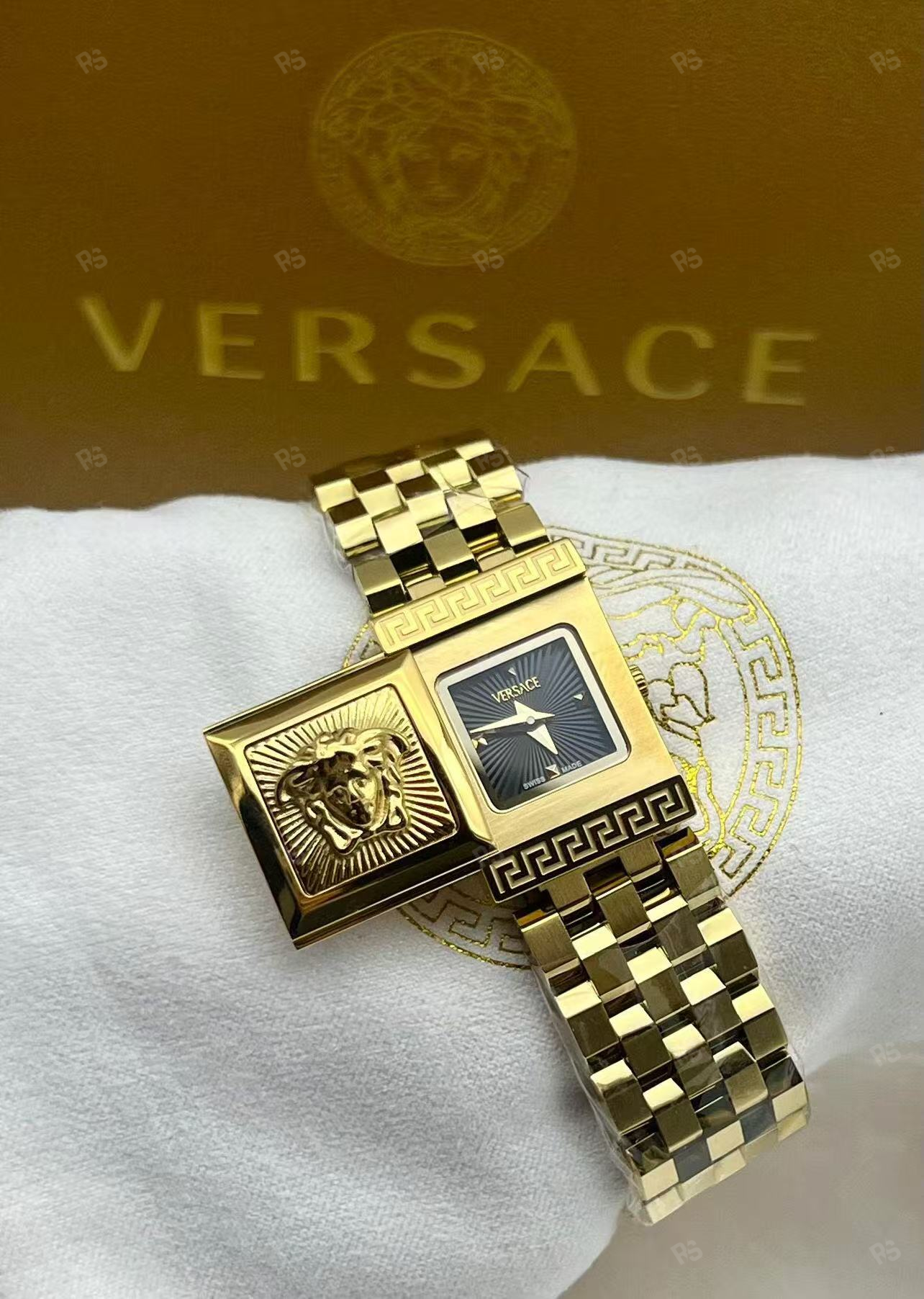 - Greca İşlemesi: Yunan anahtar (meander) motifleri — kasa üstü ve altında, klasik Versace detayı.