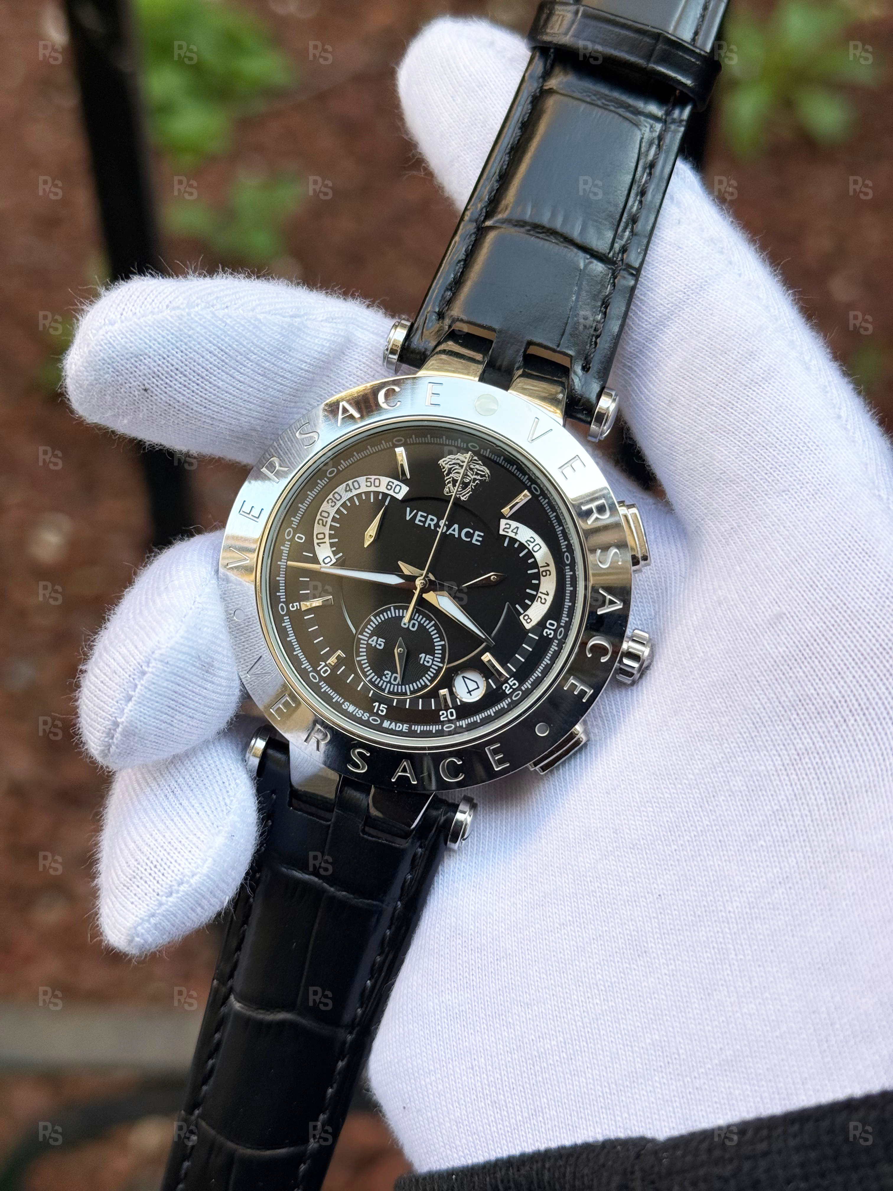 Versace V-Race, İtalyan tasarımcılığın şık ve dinamik ruhunu yansıtan bir kronograf modelidir. 42mm çapındaki gümüş tonlu (paslanmaz çelik) kasa, siyah kadran ve krokodil desenli deri kordon kombinasyonuyla hem lüks hem de modern bir görünüm sunar. Merkezde yer alan ikonik Medusa logosu, saatin özgün kimliğini vurgular.