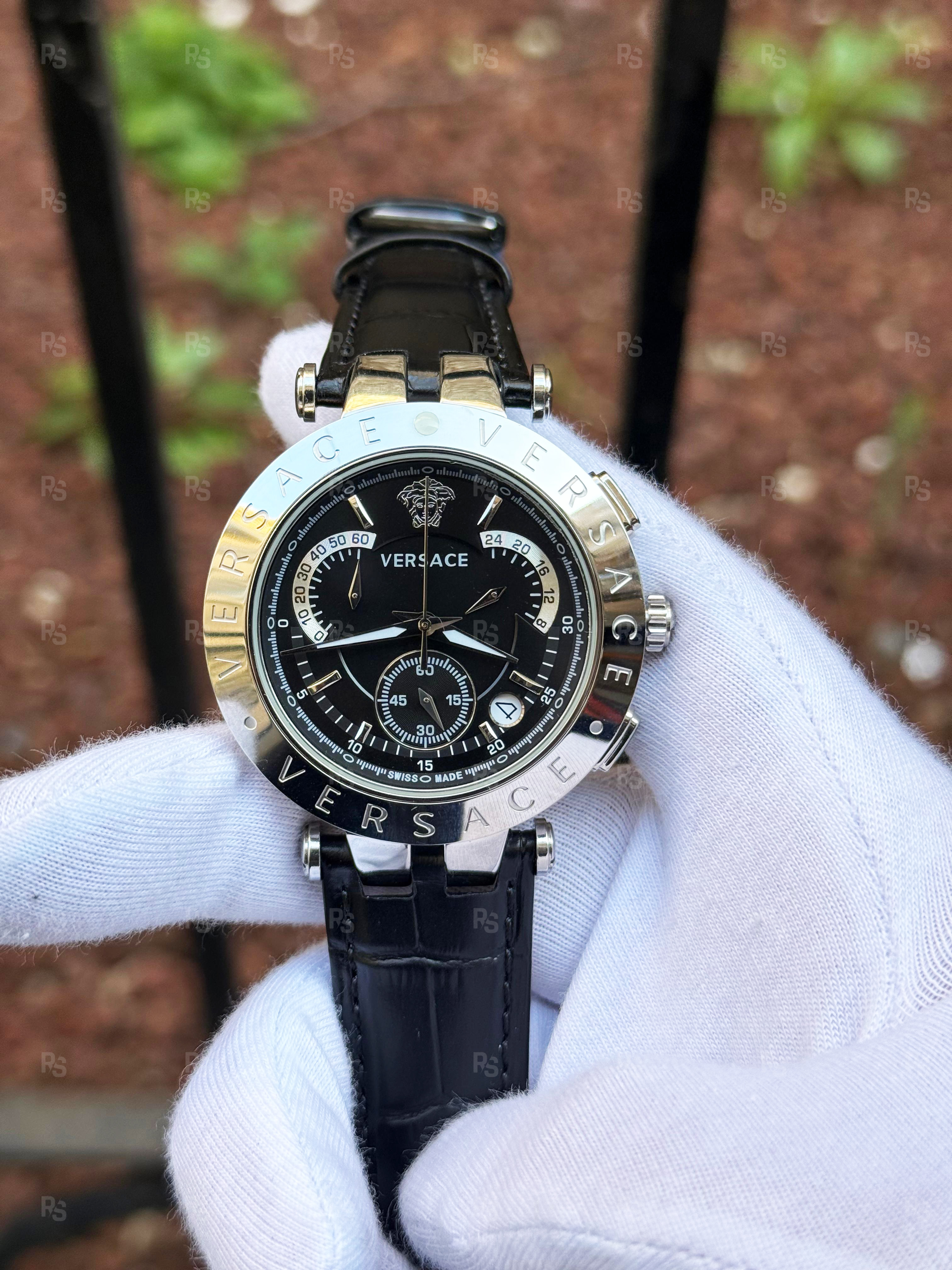 - Bezel: Aynı gümüş tonlu — “VERSACE” harfleri çevresinde yer alır, fonksiyonel ve estetik bir tasarım sunar.