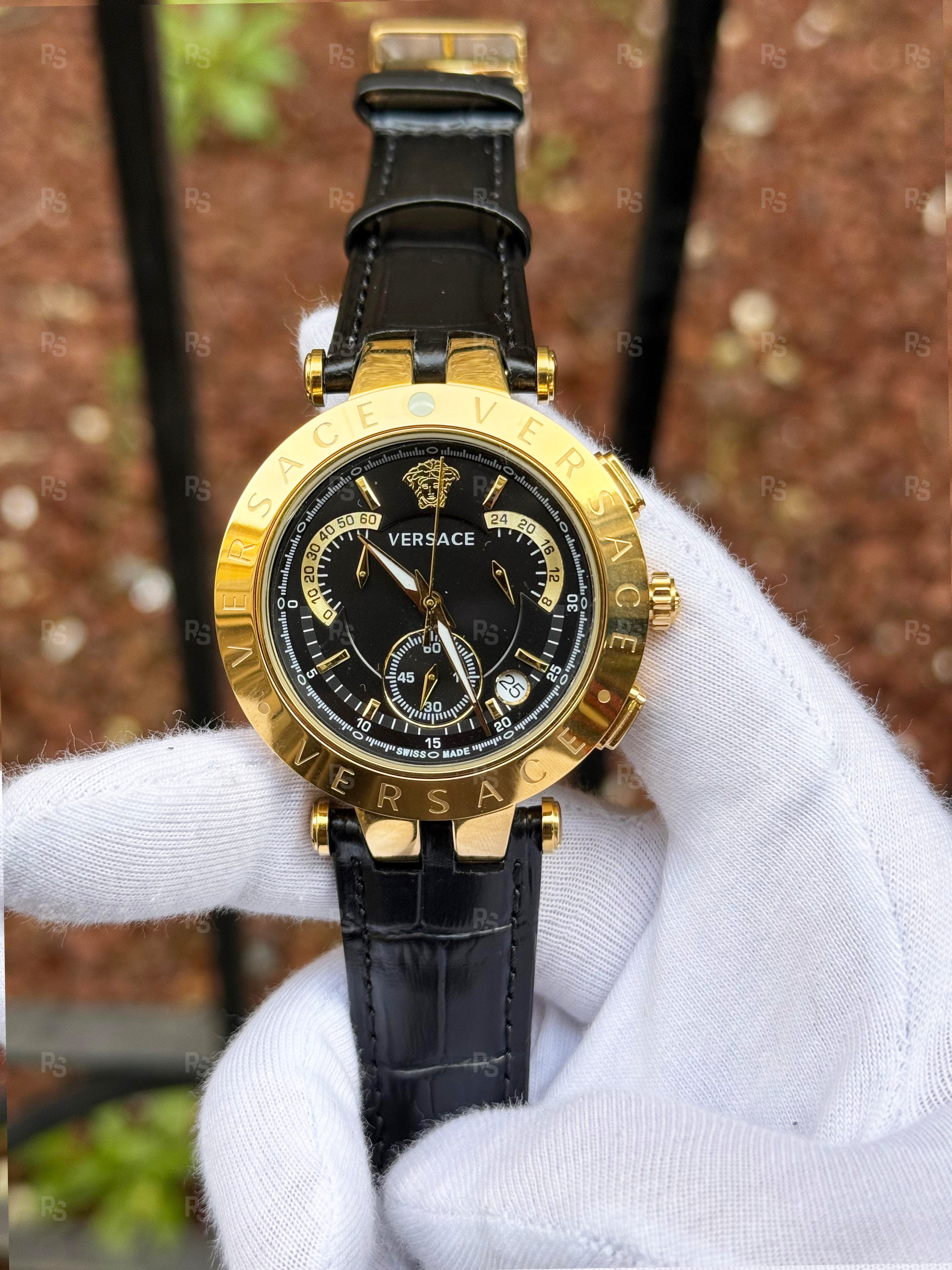 Versace V-Race, İtalyan tasarımcılığın cesur ruhunu yansıtan bir kronograf modelidir. 42mm çapındaki sarı (gold-tone) kasa, siyah kadran ve krokodil desenli deri kordon kombinasyonuyla hem lüks hem de sportif bir görünüm sunar. Merkezde yer alan ikonik Medusa logosu, saatin özgün kimliğini vurgular.